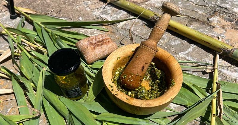 Wie du siehst, lässt sich leckeres Pesto aus Kapuzinerkresse oder aus anderen Pflanzen deiner Wahl auch Outdoor zubereiten. Da du draußen keinen Mixer hast, verwende einen Mörser. Diesen kannst du dir zur Not auch selbst herstellen.