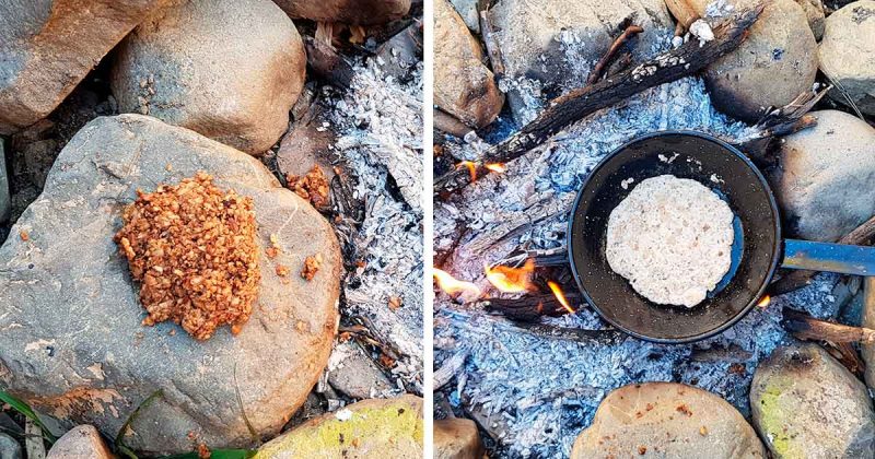 Eichelbrot Rezept ohne Mehl: Ausbacken der Fladen auf einem heißen Stein am Feuer